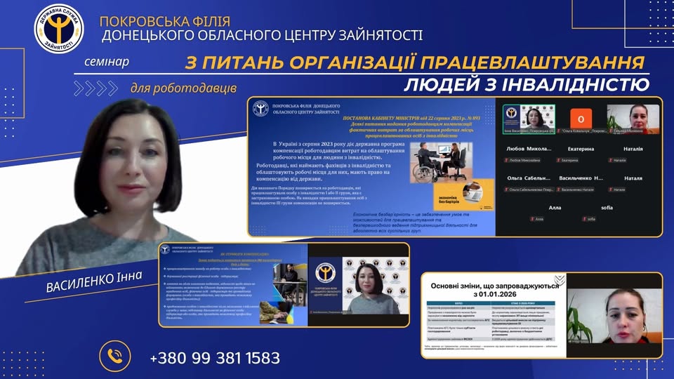 10 жовтня 2025 року за ініціативи Покровської філії Донецького обласного центру зайнятості, керівник Донецького обласного відділення Фонду соціального захисту осіб з інвалідністю взяла участь у семінарі для роботодавців.